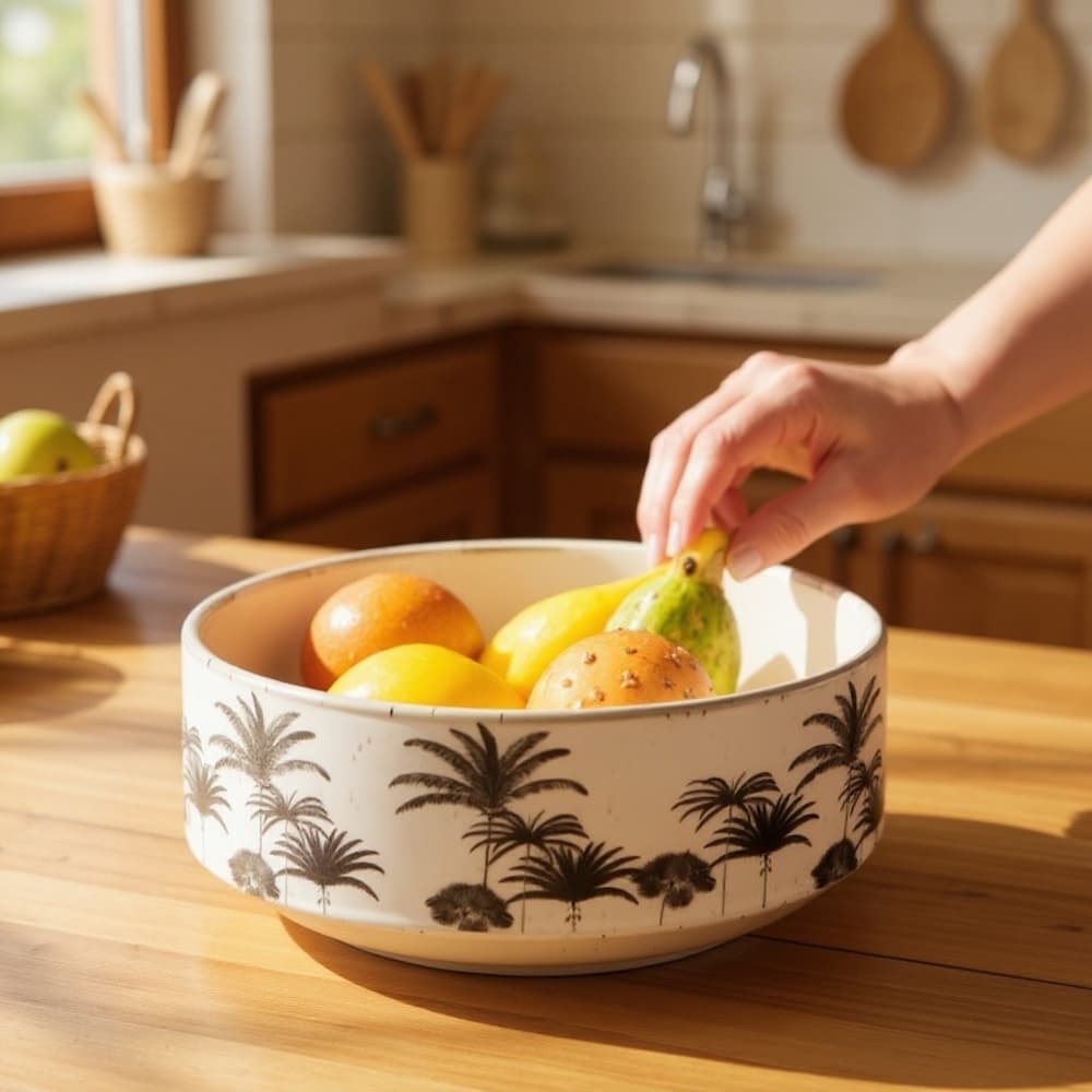 Ce joli saladier à motif palmier est parfait pour présenter vos salades composées. Sa forme est aussi idéale pour préparer un délicieux poke bowl coloré.