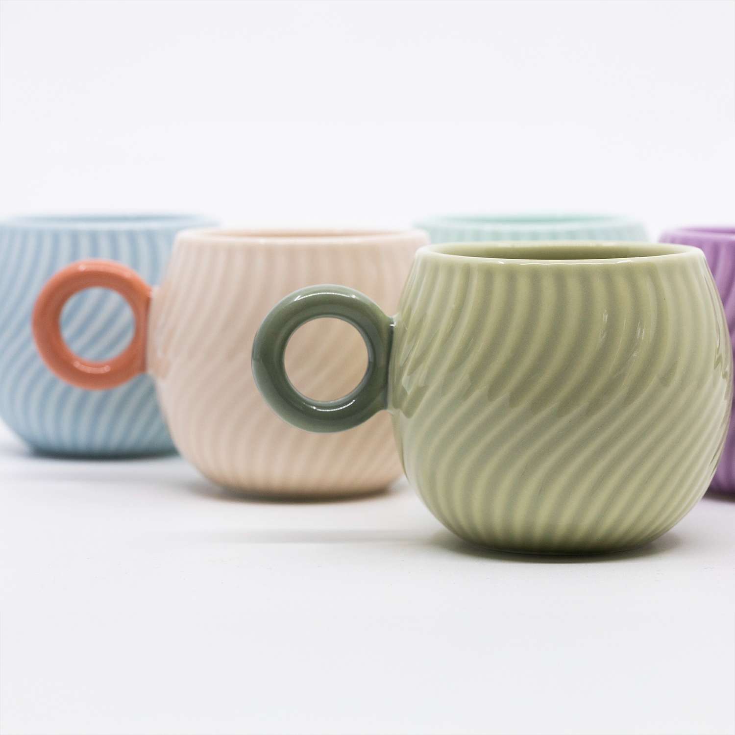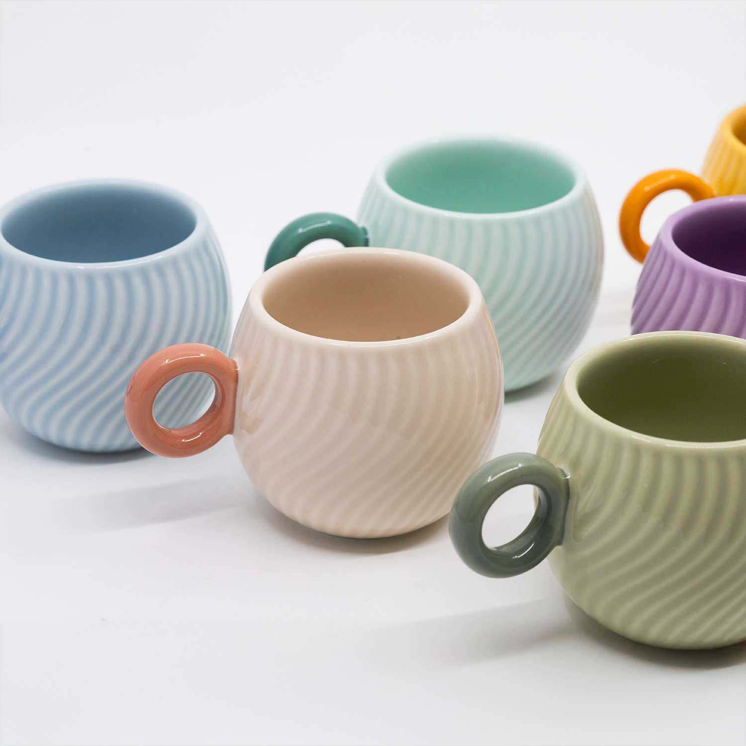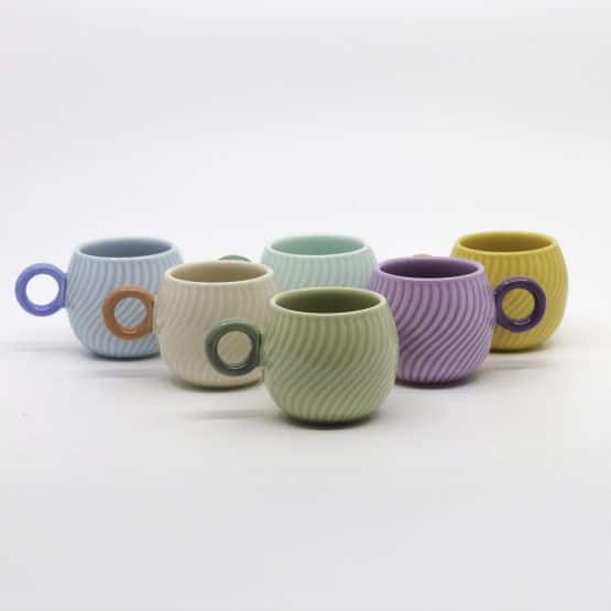 Le coffret contient 6 tasses à café de 9 cl en porcelaine : 6 coloris dont Bleu pastel, jaune pastel, vert pastel, beige, parme, vert celadon