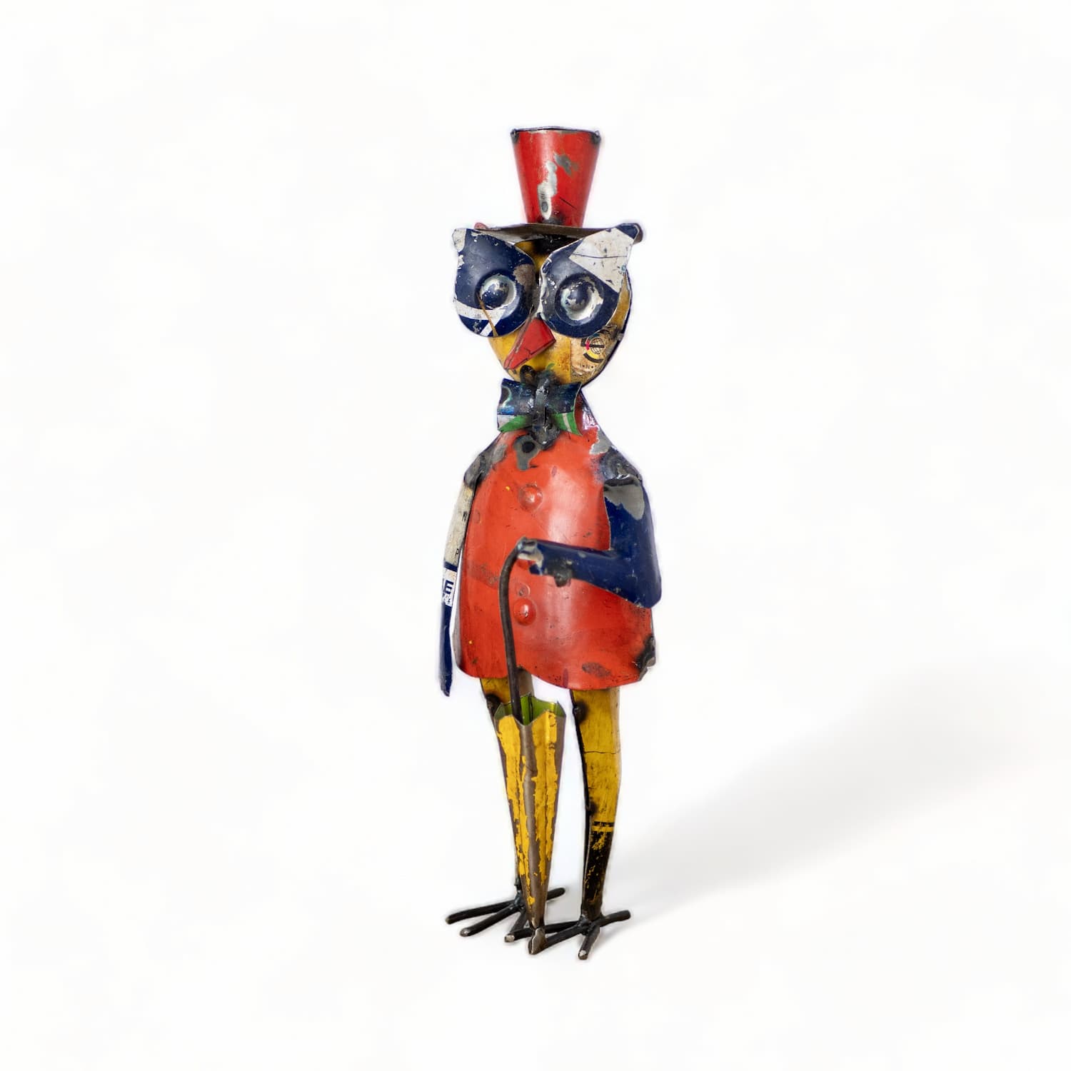 Cette sculpture artisanale de chouette en métal recyclé est réalisée avec des métaux de récupération. Cette pièce est donc unique et de légères différences de couleurs et d’aspect général peuvent bien sûr apparaitre avec la photo de l’objet proposé. Les éléments métalliques sont soudés entre eux ou rivetés.