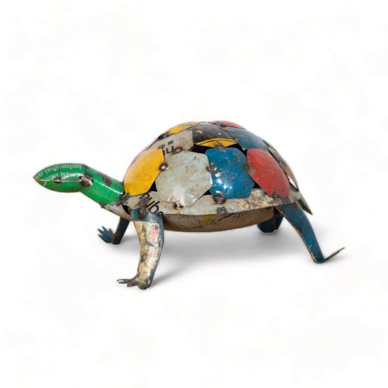 Cette sculpture artisanale de tortue originale en métal recyclé est réalisée avec des métaux de récupération. Cette pièce est donc unique et de légères différences de couleurs et d’aspect général peuvent bien sûr apparaitre avec la photo de l’objet proposé. Les éléments métalliques sont soudés entre eux ou rivetés.