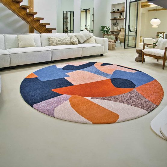 Ce tapis rond aux motifs géométriques sophistiqués deviendra la pièce maîtresse de votre intérieur. Son design contemporain, où formes abstraites et angles s’entrelacent harmonieusement, crée un point focal qui attire immédiatement le regard.