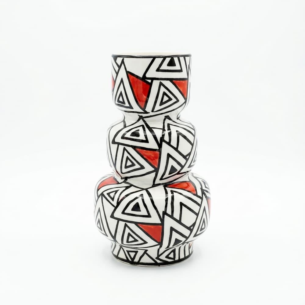 Plongez votre intérieur dans une ambiance exotique et contemporaine avec ce vase en porcelaine au style ethnique. Ses motifs géométriques en noir, blanc et rouge, inspirés des arts africains, transforment instantanément n’importe quel espace. La silhouette empilée et totémique (25 cm de hauteur) crée une présence visuelle forte, ajoutant une touche d’originalité et de caractère à votre décoration.